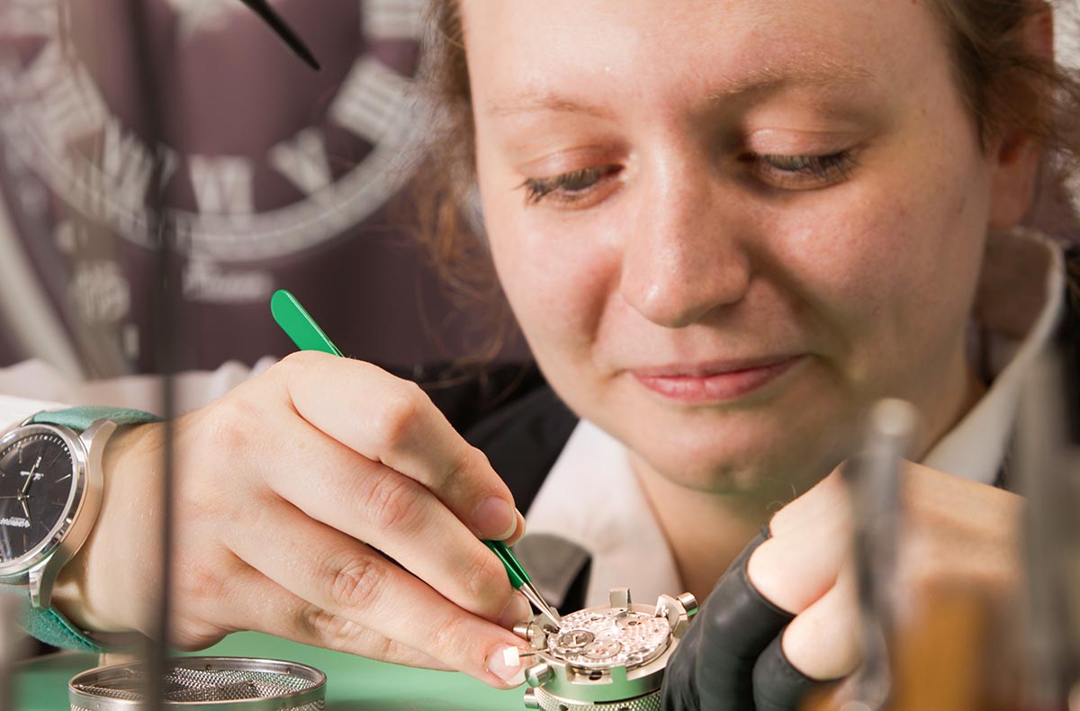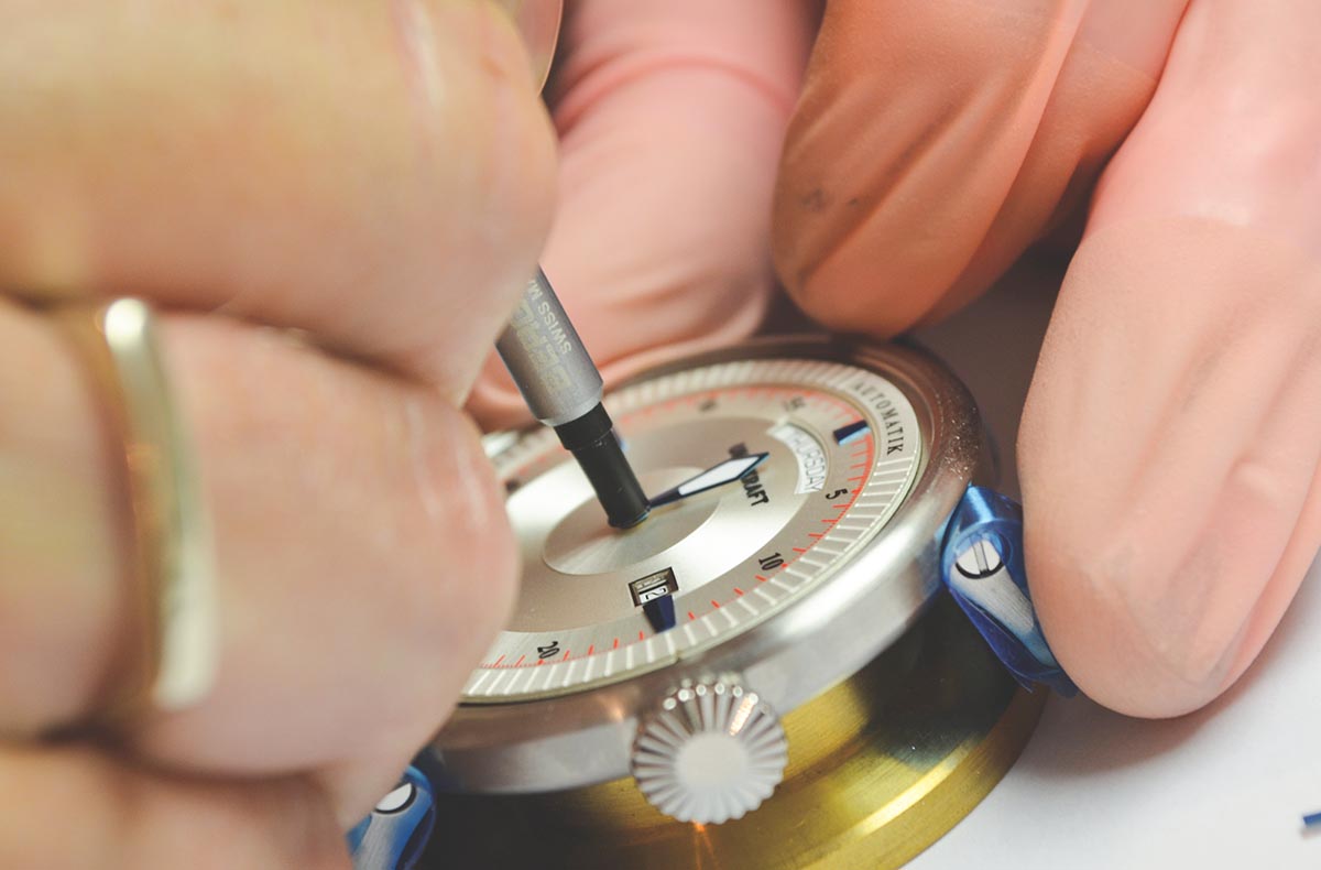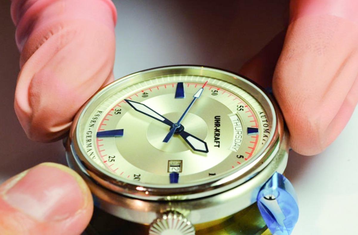 Sie haben im Uhrmacherkurs die Wahl bezüglich der Farbe des Lederbandes, das Ihre Standarduhr erhält: schwarz, weiß, hellbraun, dunkelbraun oder schwarz. Außerdem können Sie das Gehäuse auswählen: Edelstahlgehäuse/rosevergoldet, IP Black oder IP Black rosevergoldet.