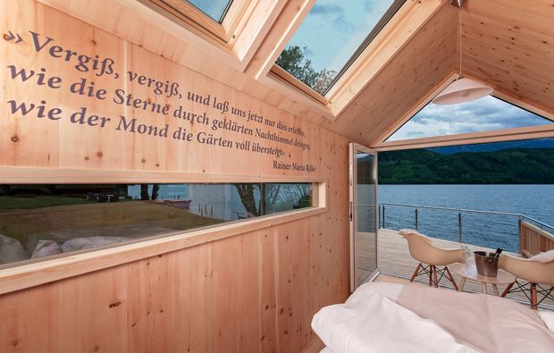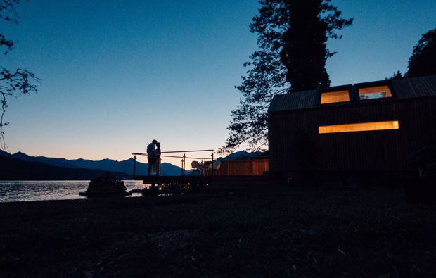 Bei Eurem zweitägigen Kurzurlaub am Millstätter See werdet Ihr in einem von insgesamt sieben außergewöhnlichen Unterkünften wohnen, die rund um den See errichtet wurden. Was Biwaks so besonders macht, bekommt Ihr dabei von der ersten Minute an zu spüren. Die aus heimischem Holz gefertigten Unterkünfte mit Panoramafenstern bestechen nicht nur durch ihre malerische Alleinlage inmitten der unberührten Natur, sondern besitzen darüber hinaus auch ihren ganz eigenen Charme. Ausgestattet sind die Domizile schließlich mit einem gemütlichen Doppelbett, einem Tisch mit Stühlen und einem Waschraum. Kurzum: Bei der Biwak Übernachtung in Millstatt habt Ihr alles, was man für einen romantischen Urlaub benötigt – und das ganz ohne Lärm und Hektik, die im normalen Hotel nur allzu schnell die Urlaubsfreude mindert.