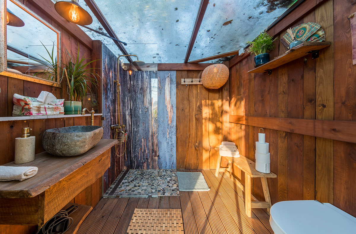 Außenbad im Bali-Style mit Regendusche, warmen Wasser, autarker Trenntoilette (ohne Streu) mit Abluftsystem