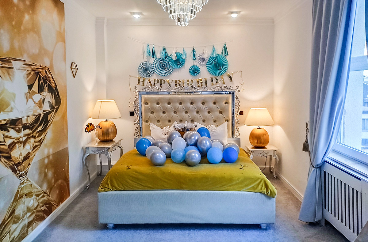 Genießt eine Übernachtung in der Golden Suite im 3* Hotel Villa Bowdy. Das moderne Zimmer ist liebevoll dekoriert und strahlt in goldener Farbe. Luftballons, Konfetti und Girlanden stimmen Euch auf Euren Geburtstag ein. Stoßt mit der Flasche Premiumsekt an und läutet Eure persönliche, gemütliche Party ein. Dazu der Genuss einer kleinen, süßen Überraschung und der Alltag ist vergessen.