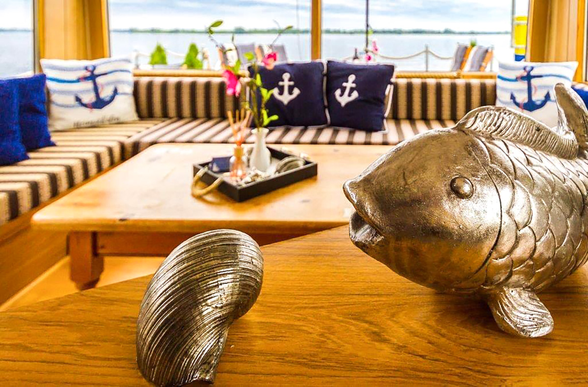 Ausstattung: Boot mit 1x Wohnbereich; 1x Schlafzimmer; 1x Kinderzimmer (2x Stockbetten); 1x Küchenbereich; 1x Bad (inkl. WC, Waschbecken, Dusche); Heizung; 1x Terrasse mit Badeleiter (möbliert)