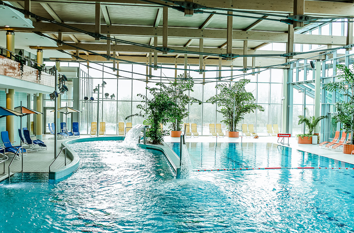 Die großzügige Badelandschaft des Hotels lädt zum Träumen und Entspannen ein und verwöhnt Euch mit 5 verschiedenen Becken und Whirlpools. Lasst Euch Seite an Seite treiben und plätschert in der 1000 Quadratmeter großen Badelandschaft entspannt vor Euch hin.