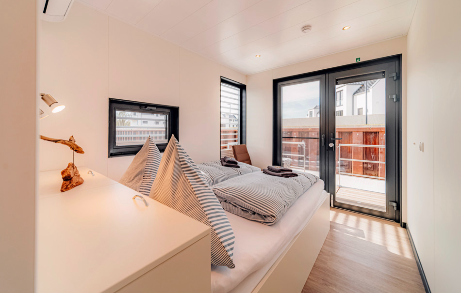 Ausstattung: Großzügiger Wohn- und Essraum, 2 Schlafräume mit je einem komfortablen Doppelbett, Bad mit Dusche, WC mit Waschtisch, überdachte Bugterrasse sowie eine Dachterrasse, Klimaanlage und Heizung, Insektenschutzgitter, Sonnen- und Sichtschutz-Plissees, Nichtraucherzimmer, digitaler Concierge-Service