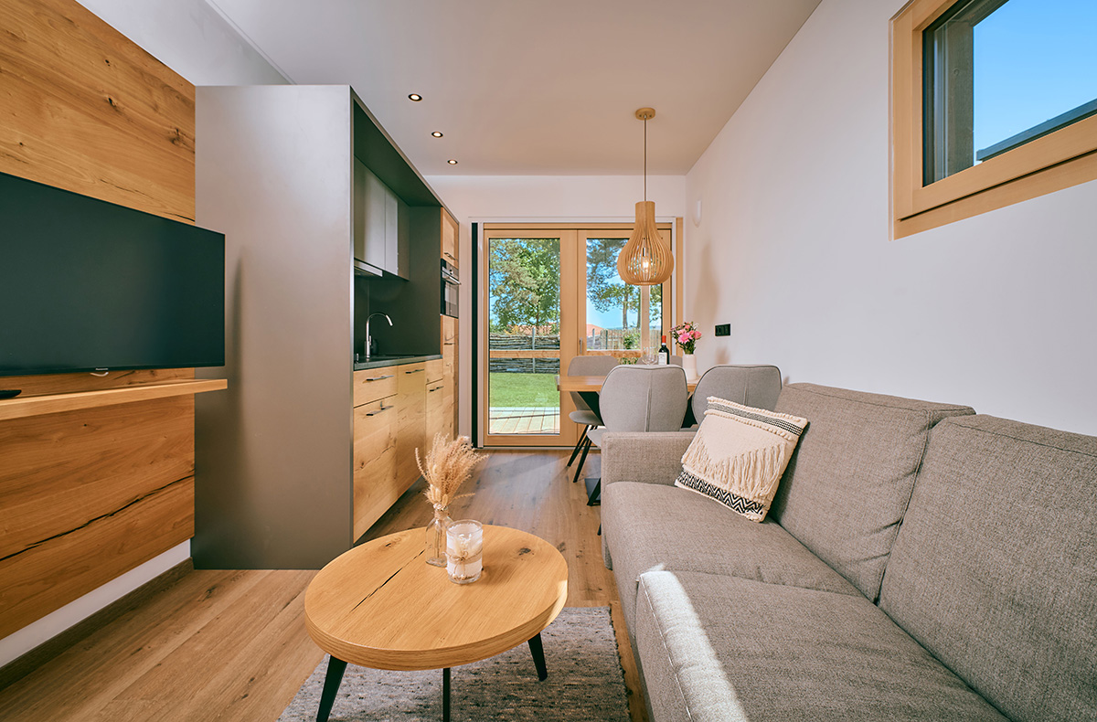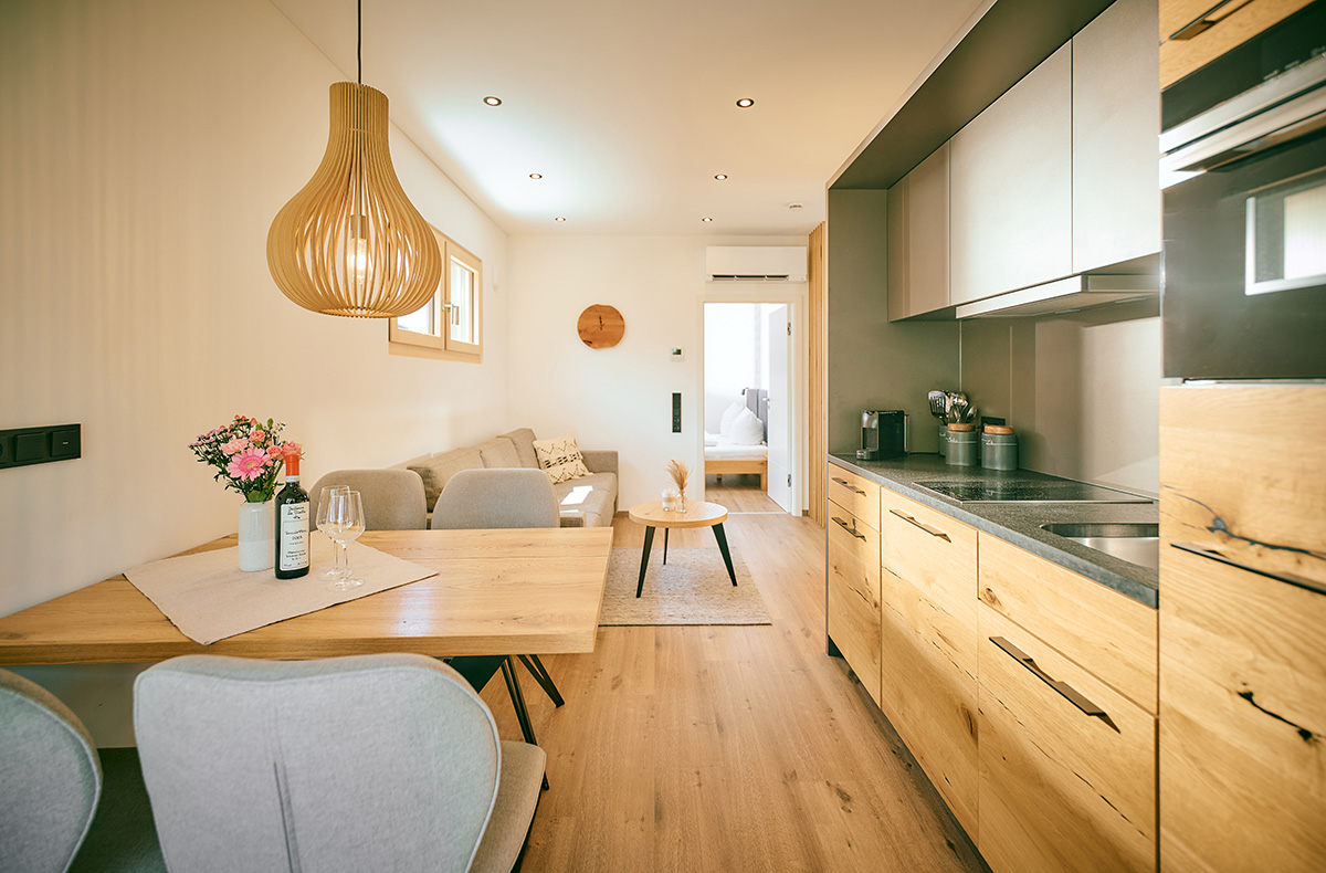 Wohn- und Essbereich mit Küche (Geschirrspüler, Kühlschrank mit Gefrierfach, Backofen, 2 Induktionskochfelder, Nespressomaschine)