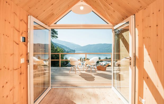 Bei Eurer ersten Besichtigung Eurer Unterkunft für die kommende Nacht wird sich das allerdings schlagartig ändern. Die rustikale Hütte mit großem Panoramafenster für die optimale Sicht ins Freie erwartet Euch zum einen in völliger Alleinlage und lädt damit zum Träumen und Entspannen ein. Abseits der lärmenden Massen könnt Ihr bei der Biwak Übernachtung in Millstatt die Natur auf Euch wirken lassen und Eure Zweisamkeit genießen. Hinzu kommt zum anderen der besondere Charme der Hütte: Die einfache und zugleich heimelige Ausstattung mit allem, was es für einen romantischen Abend braucht, macht sofort Lust, sich häuslich einzurichten.
