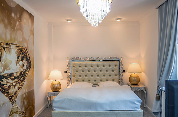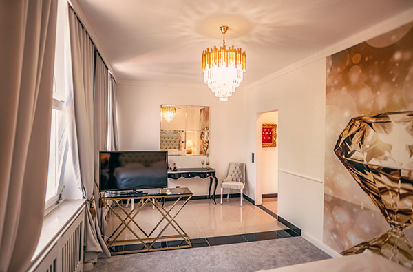 Mindestens genauso exklusiv wie das Anwesen ist auch Euer Schlafgemach: Ihr wohnt in der Golden Suite, die mit einem mondänen, leicht extravaganten Flair besticht. Die 45 großzügigen Quadratmeter verteilen sich auf einen Vorraum, den Schlafbereich mit Kingsize-Bett und das elegante Badezimmer. Letzteres hält ein ganz besonderes Highlight für Euch bereit: eine Eck-Whirlwanne! Zusammen mit einer süßen Überraschung, einer Flasche Premiumsekt und einem Duftdefuser genießt Ihr perfekte Voraussetzungen für pure Romantik!