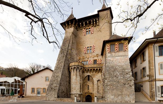 Bei Eurer Anreise zum Schlosshotel Vaumarcus werdet Ihr den prachtvollen Bau schon von weitem entdecken. Das Schloss thront auf einem Geländevorsprung über dem lieblichen Tal des Baches La Vaux. Ihr seid an der eindrucksvollen Eingangspforte angekommen? Lasst Euch vom Hotelpersonal Euer gemütliches Doppelzimmer mit historischem Mobiliar zeigen und nehmt anschließend die einzelnen Räumlichkeiten sowie den gepflegten Garten in Augenschein. Wo immer Ihr Euch auch hinbewegt, überall erwarten Euch Zeugnisse der adeligen Vergangenheit des Schlosses. Im Garten gibt es schliesslich nicht zuletzt eine prachtvolle Skulpturensammlung zu bestaunen...