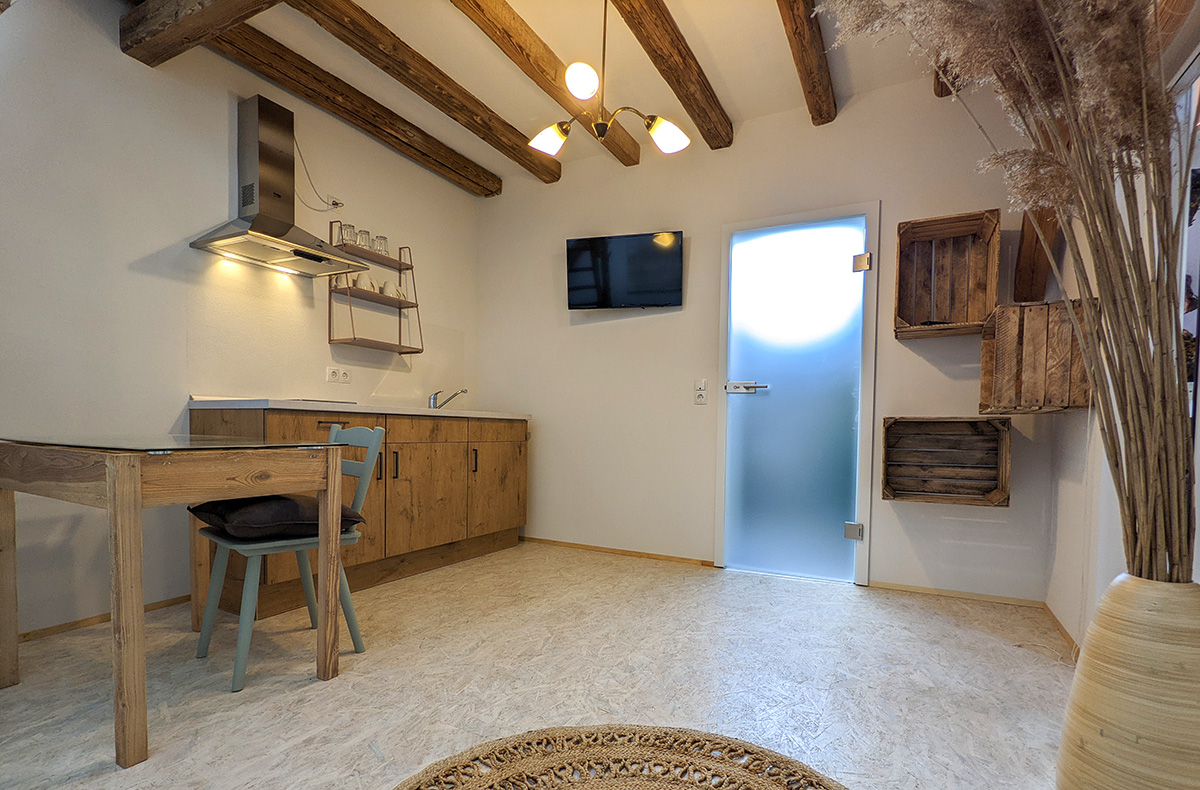 Im Tiny House gibt es alles, was Ihr braucht. Durch die geschickte Raumaufteilung habt Ihr einen Aufenthaltsraum samt Kochnische, einen gemütlichen Essbereich und eine Sofa-Ecke mit Fernseher. Also lehnt Euch abends bei einem guten Film zurück oder führt tiefgehende Gespräche, die Euch noch lange in Erinnerung bleiben. Dazu stoßt Ihr mit 2 Secco an, die bei der Tiny House Übernachtung in Geusfeld für 2 Nächte inklusive sind. Ihr merkt, bei diesem außergewöhnlichen Erlebnis werden Gemütlichkeit und Genuss großgeschrieben.