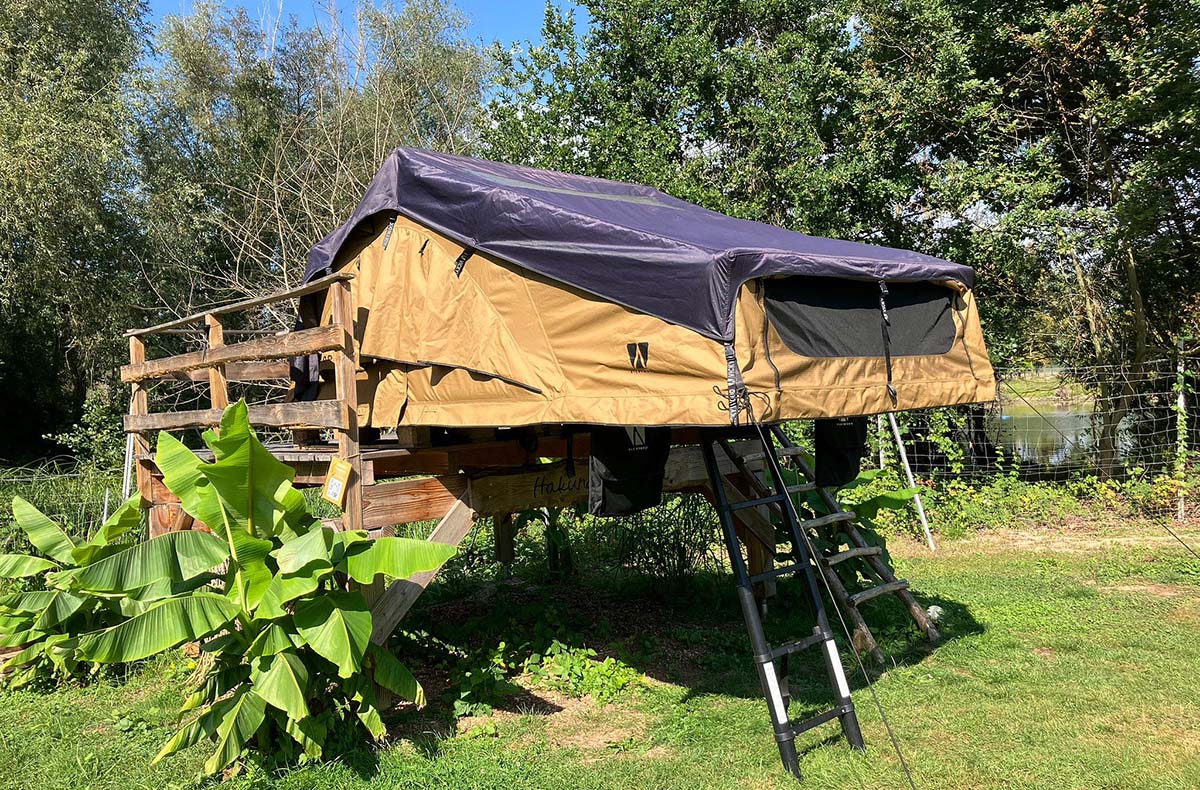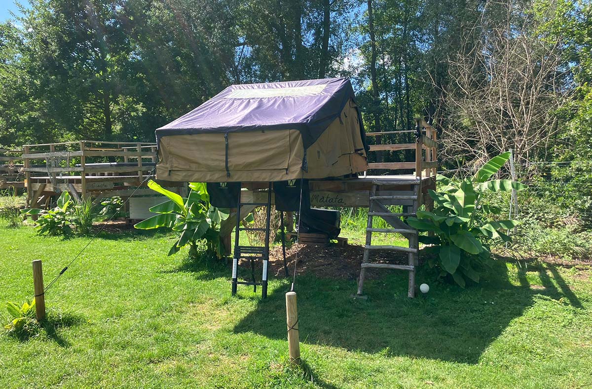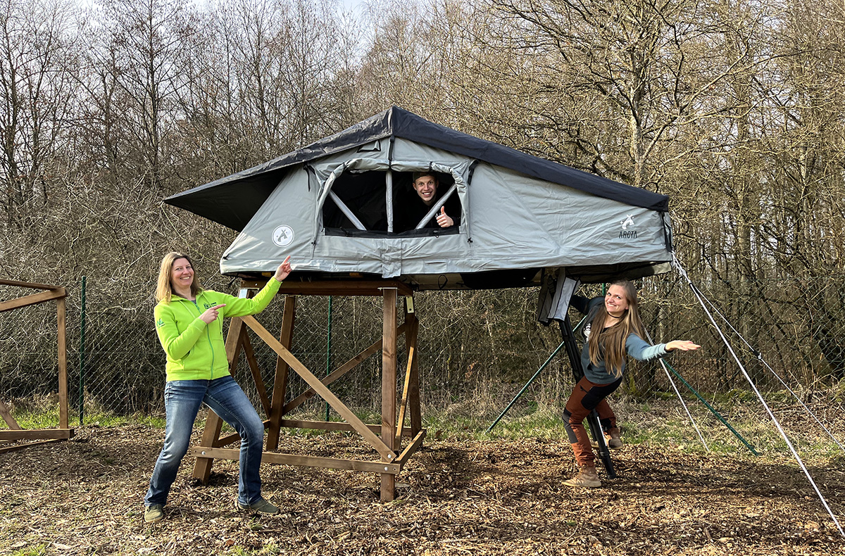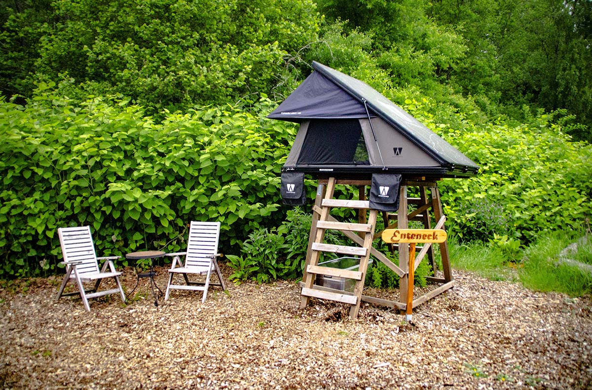 Verbringt zwei Nächte im gemütlichen Dachzelt auf der Plattform Vogelgucker. Das Rauschen der Blätter und die klare Sternennacht schaffen eine unvergessliche Atmosphäre. Die Feuerstelle lädt dazu ein, abends zusammenzusitzen und Geschichten zu erzählen, was den Natururlaub perfekt abrundet.