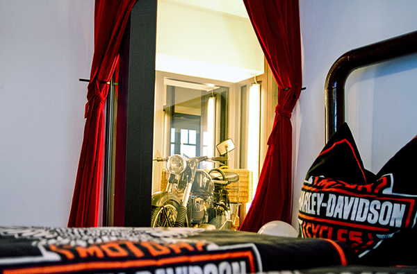 Ausgestattet mit Mobiliar, das vom schmiedeeisernen Bettrahmen mit Harley-Lenker und Auspuff bis hin zum schwarz lackierten Metallspint reicht, bietet das Zimmer ein ganz besonderes Flair, das begeistert. Dieser Effekt wird durch den asphaltierten Zimmerboden und detailgetreue Accessoires an den Wänden zusätzlich verstärkt. Immer im Blick hast Du natürlich Deine eigene Maschine und als Extra-Bonbon eine echte Harley, die direkt durch einen Showroom vom Bett aus bewundert werden kann.