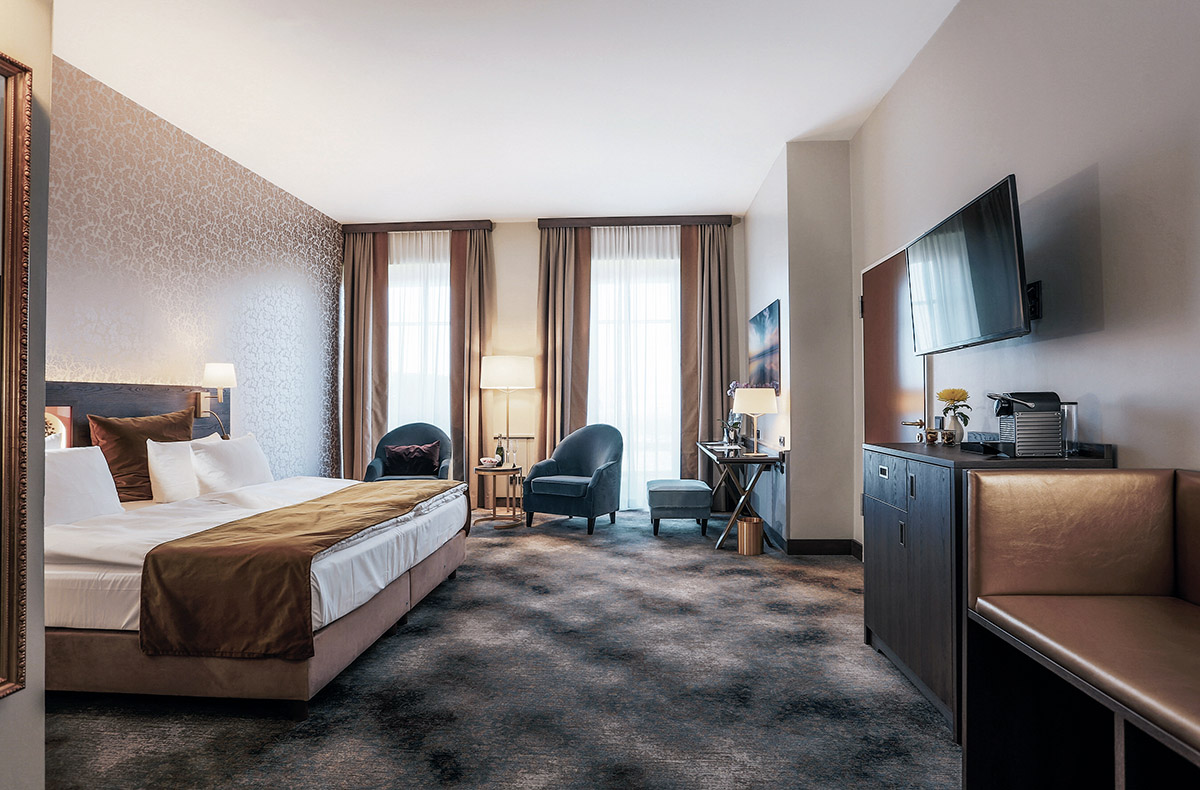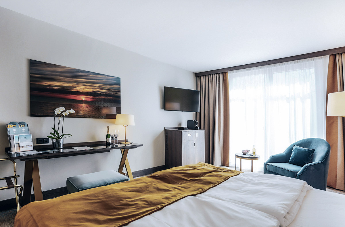 Das Schlosshotel Fleesensee befindet sich im staatlich anerkannten Erholungsort Göhren-Lebbin, im hohen Norden Deutschlands. Die nächsten zwei Nächte verbringt Ihr in einem Doppelzimmer mit hochwertiger Ausstattung und klassischem Design. Deckenhohe Fenster sorgen für eine lichtdurchflutete Wohnatmosphäre und bieten Euch einen imposanten Ausblick in den Schloss-Innenhof.