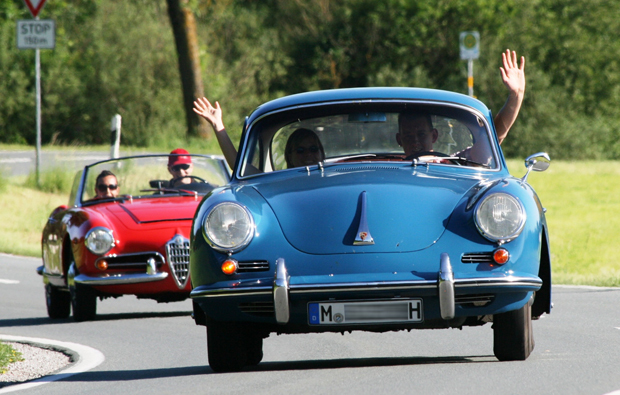 Ca. 250 km Fahrleistung in einem der folgenden Fahrzeuge: Alfa Romeo Giulia Spider, Austin Healey 3000 MK I, Ford Mustang V8 Cabrio, Mercedes Benz 230 SL, Porsche 356 B Coupe, Porsche 550 Spyder, Porsche 911 Targa