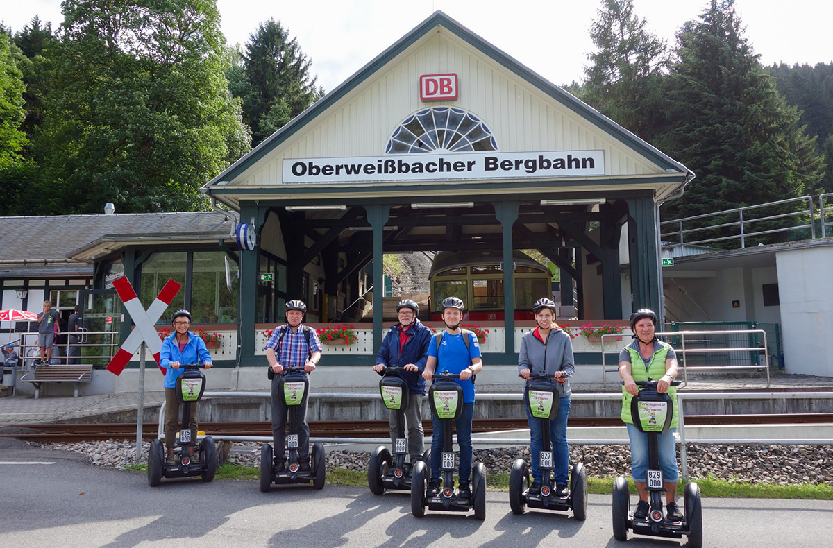 In Sitzendorf angekommen, wo das Thüringer Porzellan erfunden wurde, macht Ihr einen Stopp am Weihnachtsbahnhof. Zurück geht es durch die idyllische Landschaft zur Bergstation, wo dich das nächste Abenteuer erwartet. Denn hier tauscht Ihr die Segways gegen Tickets für die Thüringer Bergbahn ein, die bis heute steilste Standseilbahn der Welt zum Transport normalspuriger Eisenbahnwagen. Ein Highlight ist die Fahrt im Cabrio Wagen der Bergbahn, um das herrliche Panorama zu genießen.