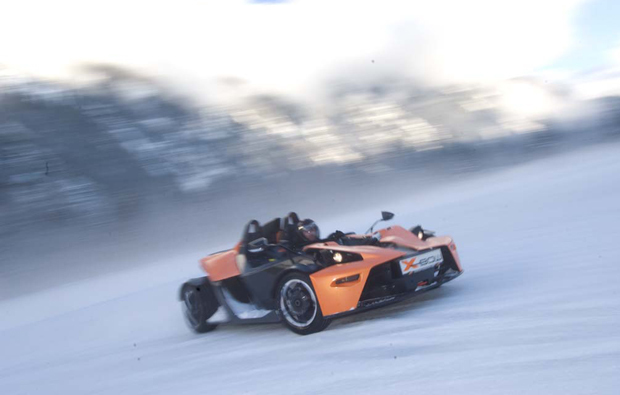 Der KTM X-BOW bietet Dir das authentische Fahrgefühl eines Formel 1 Boliden. Der größte Unterschied? Die Spike Bereifung, die extra für die Wintercup Rennen angebracht wird. So kannst Du mit bis zu 120 km/h über den eisigen Parcours driften. 270 PS unter der Haube und ein dem Formel Rennsport nachempfundenes Pushrod-Fahrwerk unter dem Hintern – nutze den gesamten Spielraum des Sechsgang-Getriebes und lasse die Konkurrenz in einer Wolke aus Eisstaub zurück!