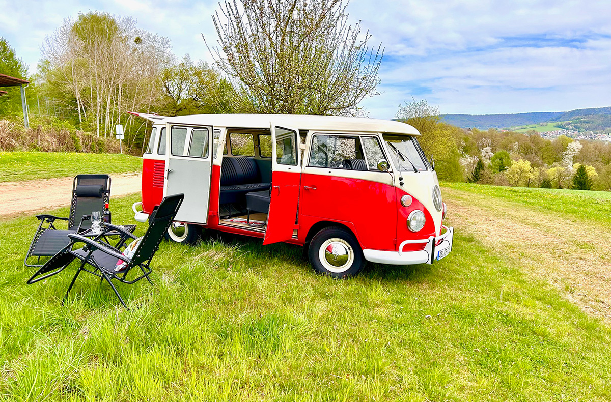 Ein liebevoll restaurierter VW Bulli wartet auf Dich, um Dich sanft durch die sanften Hügel und tiefen Wälder des Spessarts zu tragen. Entspannt folgst Du einem handverlesenen Routenvorschlag, der Dich durch den idyllischen Kahlgrund führt, vorbei an verwunschenen Tälern bis hin zum prächtigen Schloss Johannisburg. Mit an Bord ist alles, was Du für eine stilvolle Picknicktour brauchst: Picknickkorb, Stühle, Tisch und Decke – perfekt für eine Pause auf einer einsamen Wiese unter freiem Himmel. Die 50 Freikilometer schenken Dir die Freiheit, in Deinem Tempo unterwegs zu sein. Lass Dich vom Charme des Bullis verzaubern und mach Dich auf den Weg zu Momenten, die lange in Erinnerung bleiben.