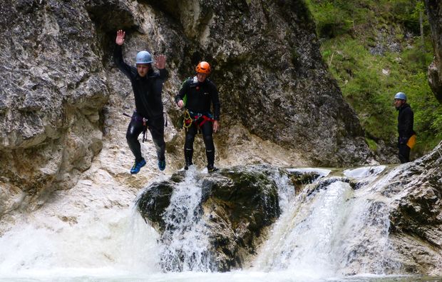 Der Start der fünfstündigen Canyoning-Tour beginnt mit einem leichten Aufstieg zur Einstiegsstelle. Von dort aus seilst Du Dich vom Felsen in Richtung Wasser ab und bist froh über den schützenden Neoprenanzug. Im weiteren Verlauf gleitest Du über natürliche Rutschbahnen und springst in Wasserbecken hinein. Hier hast Du die Möglichkeit, sowohl die Kraft der Natur unverfälscht zu erleben als auch in sportlicher Hinsicht Deine persönlichen Grenzen auszutesten.