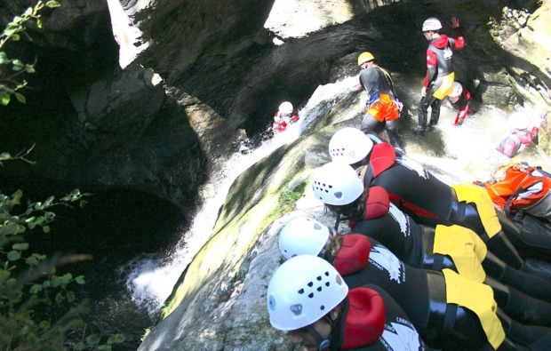 Zunächst triffst Du Dich mit dem Guide und den anderen Teilnehmern in der Basisstation, wo Du nach der Begrüßung und dem Kennenlernen mit Deiner hochwertigen Ausstattung versorgt wirst. Dann geht es mit Kleinbussen zum Einstieg in den Berg. Die Tour dauert insgesamt rund vier Stunden, in denen Du nicht nur zahlreiche kickende Momente erlebst, sondern auch jede Menge lernst – über den Berg, über Dich selbst und übers Canyoning. Schon der Einstieg in den Berg kann sich sehen lassen: Du blickst hinab in einen 30 Meter herabstürzenden Wasserfall. In den nächsten Stunden erwarten Dich beim Canyoning in Haiming nicht nur zahlreiche, weitere atemberaubende Anblicke, sondern auch jede Menge Herausforderungen, wie 12 Meter lange Wasserrutschen, Sprünge bis zu zehn Metern und Abseilhöhen bis zu 12 Metern!