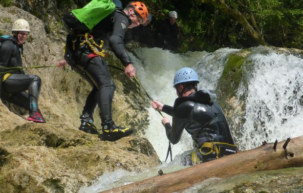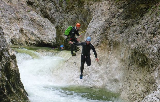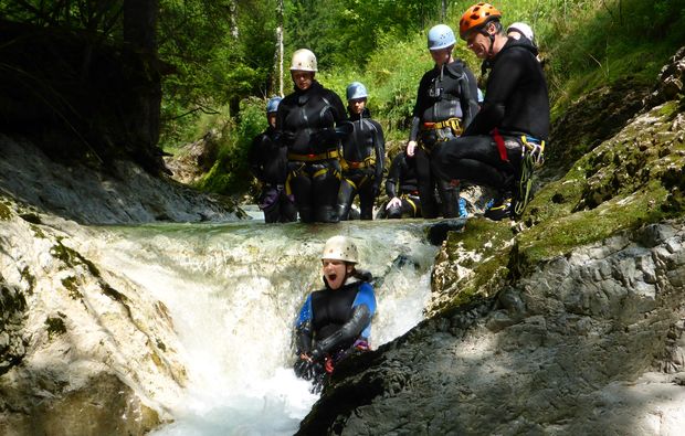 Dein Ehrgeiz ist geweckt? Bevor das Canyoning am Traunsee startet, bekommst Du selbstverständlich von einem erfahrenen Guide eine umfassende Einweisung in die Ausrüstung und die Techniken beim Canyoning in Gmunden. Bist Du dann mit Neoprenanzug, Klettergurt und -helm ausgestattet, kann das Canyoning am Traunsee endlich beginnen. Nach einer etwa einstündigen Wanderung erreichst Du gemeinsam mit Deinen Mitstreitern die erste Wassergumpe, eine Vertiefung im Flussbett. Von hier aus bewegt Ihr Euch nun je nach Beschaffenheit der Landschaft kletternd, springend rutschend oder auch mal tauchend vorwärts. Unterwegs genießt Ihr den Blick auf tosende Wasserfälle und majestätische Felsen, rutscht von ganz oben direkt in das erfrischende Nass oder seilt Euch, wenn der Sprung doch einmal zu weit erscheint, einfach ab. Solltest Du Dich beim Canyoning in Gmunden zwischendurch etwas unsicher fühlen oder einmal nicht weiterwissen, steht Dir der Profi natürlich immer zur Seite.