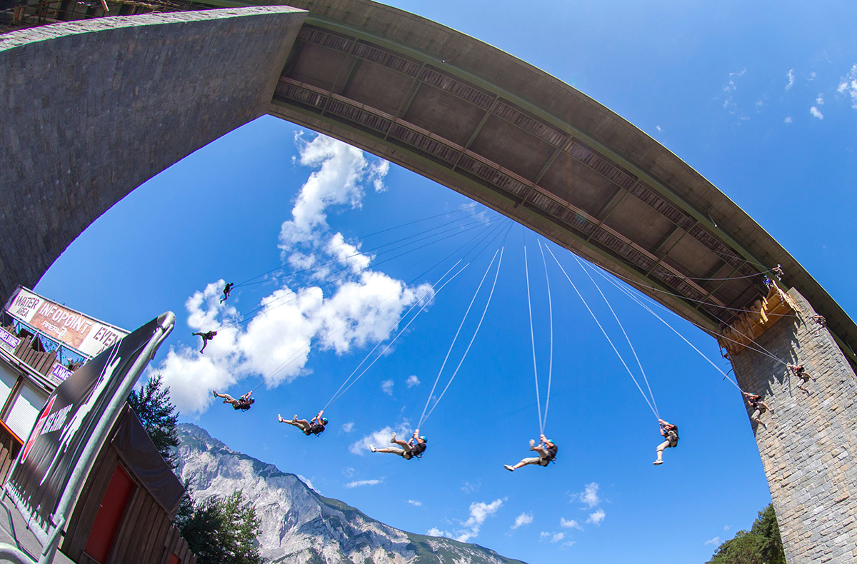Dein Tag voller Abenteuer beginnt am Brückenpfeiler. Du legst einen Klettergurt an und bestens gesichert stürzt Du Dich beim Mega Swing aus 27 Metern in die Tiefe. Ein paar Sekunden freier Fall, Dein Herz pocht und Du wirst vom Seil aufgefangen. Mit vollem Puls schwingst Du durch die Luft, einfach fantastisch!