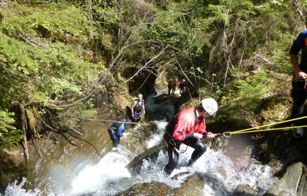 Ein Kleinbus bringt Euch zu Eurer heutigen Einstiegsstelle der Canyoning Tour. Ein Guide gibt Euch eine Sicherheitseinweisung zum richtigen Verhalten in der Schlucht und dann geht’s auch schon los. Verschiedene Herausforderungen warten auf Euch. Mal müsst Ihr Euch abseilen, dann kommt ein Fluss, der wie eine Rutsche ist. Ihr seilt Euch bei Schluchten ab und sogar mitten im Wasserfall. Nach der Canyoning Tour könnt Ihr Euren Tag im Freibad ausklingen lassen. Klingt gut? Dann rein ins Vergnügen!