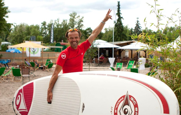 Das SUP am Rhein findet in der Strandperle in Geisenheim statt. Hier wird Dir von erfahrenen Trainern Schritt für Schritt das gekonnte Paddeln erklärt. Auf dem Board stehen, ohne von ins Wasser zu fallen? Das scheint im ersten Moment nicht möglich, ist es aber! Durch die besondere Form und Breite des Boards ist es leicht, sich auf dem ständig bewegenden Gewässer zu halten. Hüftbreit hinstellen, die Knie leicht beugen, noch einmal locker machen. Mit wenigen Paddelschlägen schaffst Du es schnell, sicher auf den Wellen zu reiten.