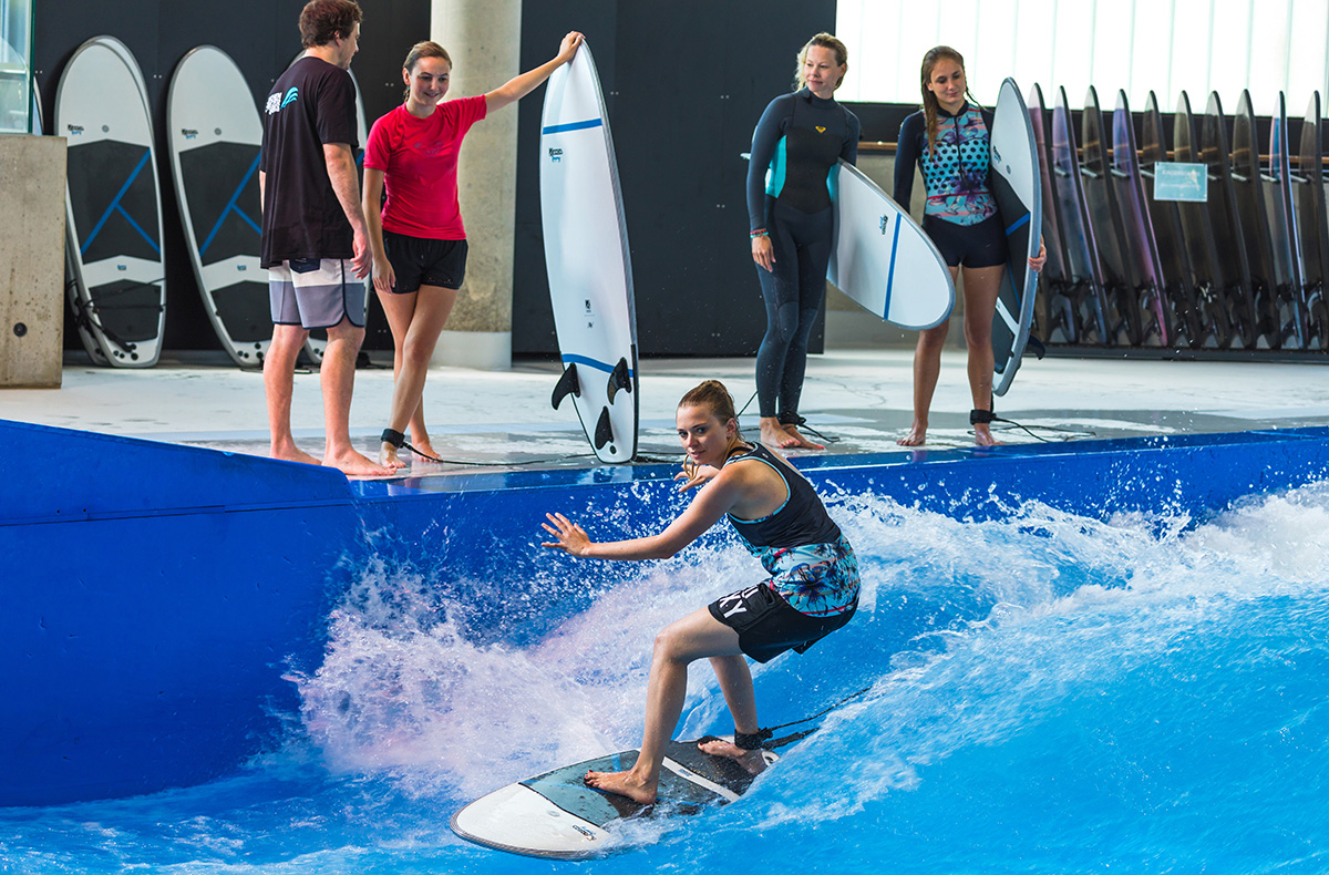 Nach der theoretischen Einweisung folgt die praktische Umsetzung im Indoor-Surfkurs. Die Wassertiefe ist mit 1,20 Meter ideal für authentisches Surfen. Mit Hilfe der Lernstange für Einsteiger gelingt der erste Wellenritt im Handumdrehen. Du hast zwei Möglichkeiten, beim Indoor-Surfen die Welle zu reiten: Entweder mit einem Bodyboard oder einem speziellen Flowboard. Während Du Dich auf dem Bodyboard auf dem Bauch liegend oder kniend auf die Welle begibst, kannst Du auf dem Flowboard auch stehen.