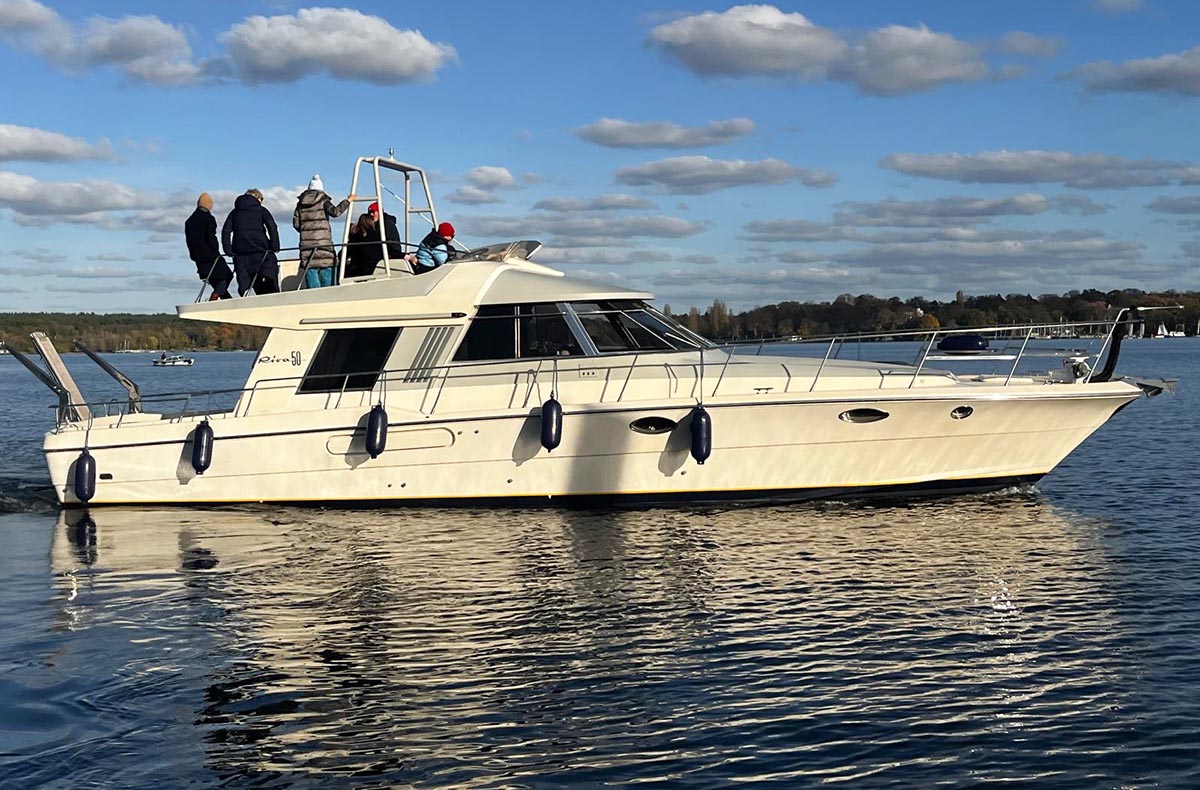 Genießt eine stimmungsvolle Yachttour in Berlin und lasst Euch vom winterlichen Glanz der Sieben Seen verzaubern. An Bord der eleganten Riva 50 Superamerica gleitet Ihr entspannt vorbei an geschichtsträchtigen Schlössern wie dem Cecilienhof und Schloss Babelsberg, prachtvollen Villenvillen und der stillen Schönheit der Pfaueninsel. Die beheizten Innenbereiche bieten Wohlgefühl auch an kühleren Tagen, während das Vorderdeck und die Flybridge Raum für stille, eindrucksvolle Ausblicke schaffen. Ein köstlicher Glühwein rundet das Erlebnis stilvoll ab und schafft einen warmen Moment der Gemeinsamkeit. Perfekt, um Gemeinsamezeit zu verschenken oder besondere Erinnerungen zu schaffen – lasst Euch verzaubern zwischen Wasser, Licht und winterlicher Eleganz.