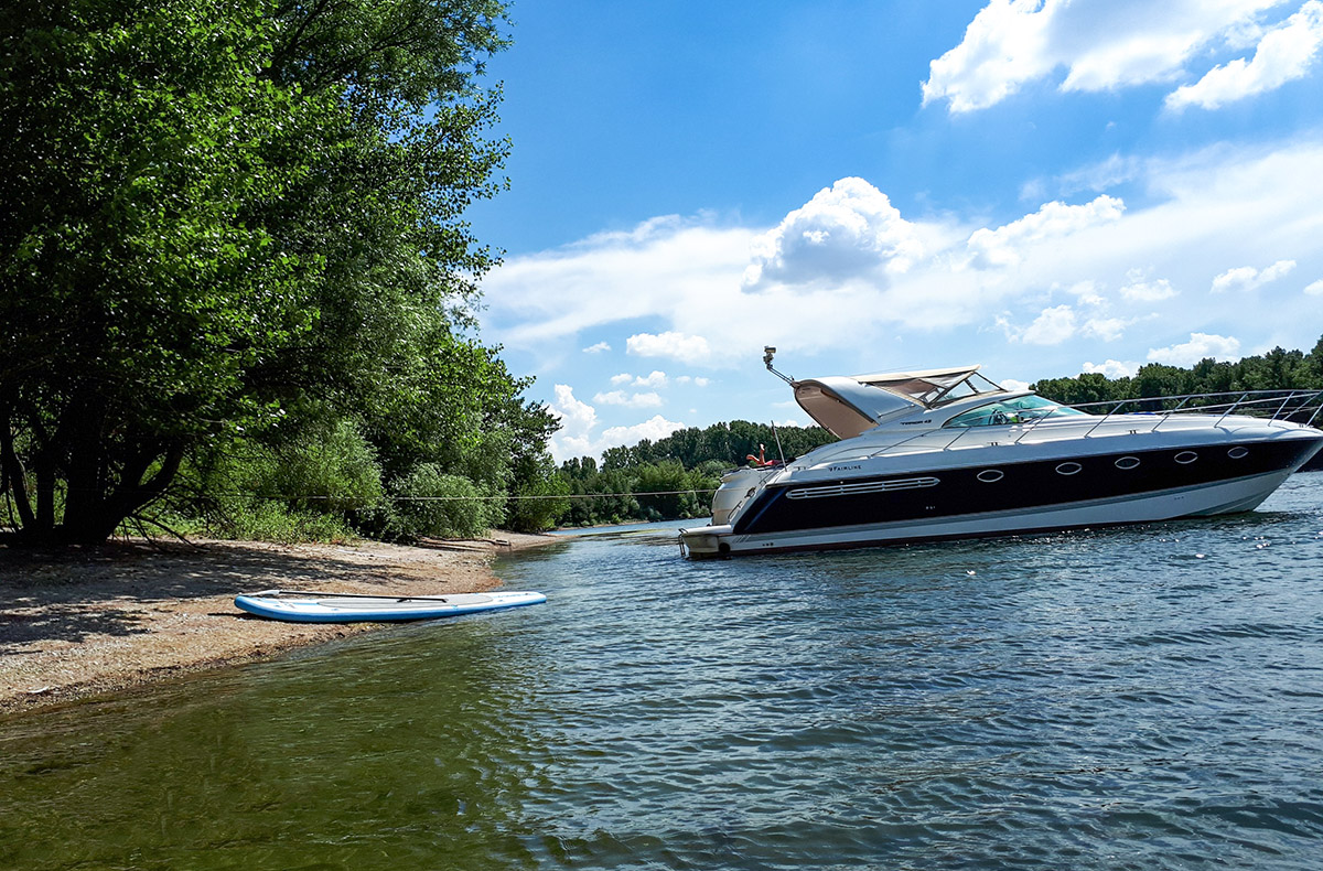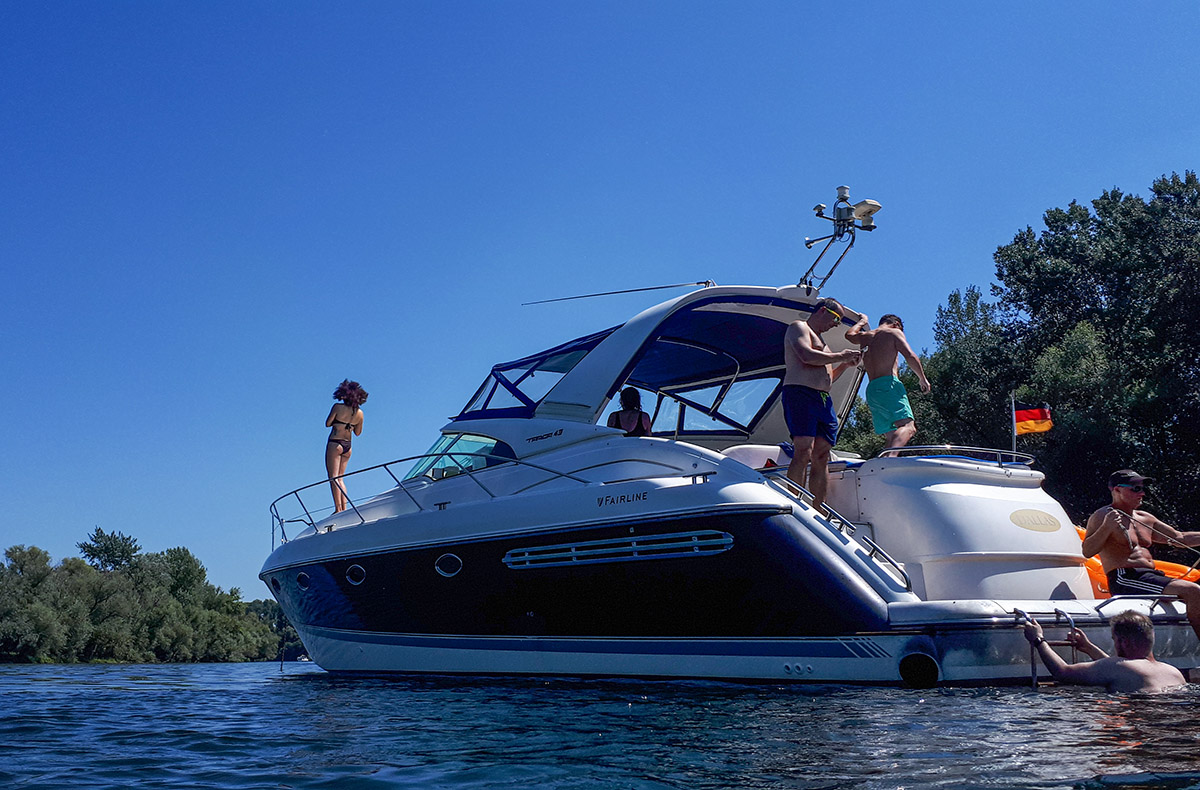 An der Hafenmauer im rheinland-pfälzischen Speyer erwartet Dich eine vollgetankte 13 Meter Fairline Yacht. Normalerweise siehst Du Boote in dieser Größe nur im Meer. Du bekommst das Privileg, damit auf dem Rhein zu fahren. Dein Ziel ist die Blaue Lagune. In das Naturschutzgebiet dürfen nur sehr wenige Motorboote fahren. Deines ist eines davon.