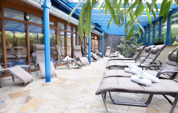 Für Dein perfektes Wohlfühlprogramm kannst Du neben den Anwendungen den Rest des Tages im Spa verbringen. Entweder Du lässt Dich entspannt im Becken treiben oder Du hängst auf einer der zahlreichen Liegen Deinen Gedanken nach. Außerdem warten im Schwimmbadbereich eine Gegenstromanlage, Massagedüsen und Erlebnisduschen auf Dich. Solltest Du ein Sauna-Fan sein, wird Dir hier einiges geboten. Du hast die Wahl zwischen finnischer, Bio- oder Dampfsauna. Abkühlung bekommst Du in der Eisgrotte oder im Kneippbecken. Möchtest Du Dich sportlich betätigen, steht Dir auch der Fitness- und Bewegungsbereich mit verschiedenen Geräten zur Verfügung.